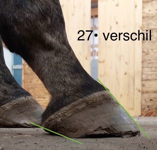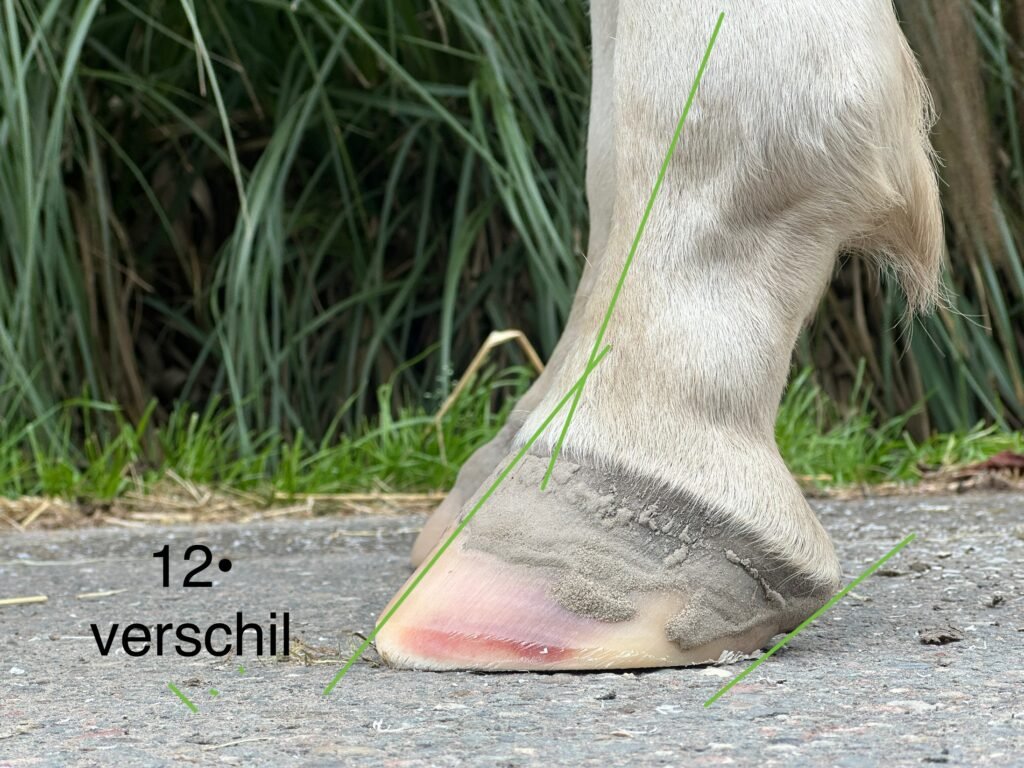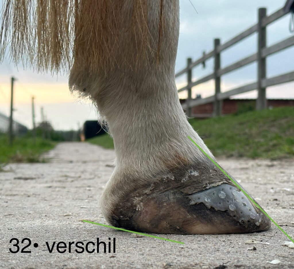 Het eerste grote én duidelijke kenmerk: ondergeschoven hielen. Hielen worden ondergeschoven genoemd als de hoek van de hoefwand aan de voorkant en de hoek van de hielen meer dan 5 graden afwijkt. Kijk maar eens naar de foto’s rechts en onder, hierbij wordt het verschil in graden aangegeven.
